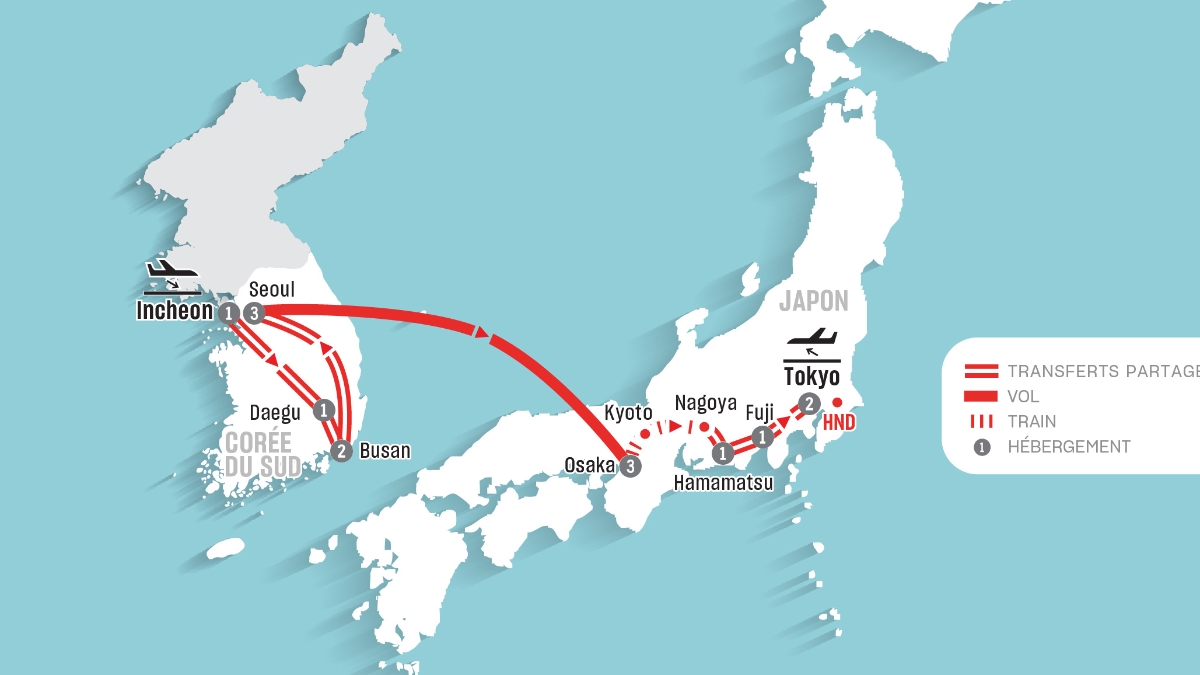 • 14 nuits d’hébergement supérieur avec repas selon l’itinéraire (1 nuit à Incheon, 1 nuit à Daegu, 2 nuits à Busan, 3 nuits à Séoul, 3 nuits à Osaka, 1 nuit à Hamamatsu, 1 nuit à Fuji, 2 nuits à Tokyo)