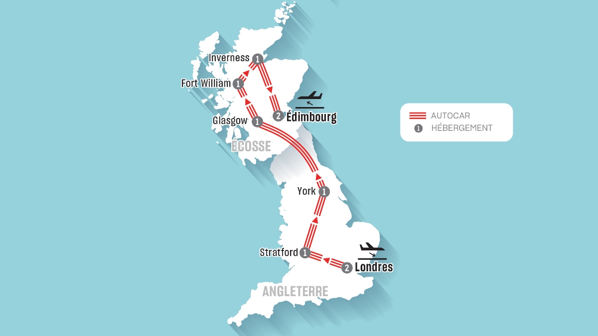 Les faits saillants de cet itinéraire comprennent des nuits à : Londres, Stratford Upon Avon, Liverpool, York, Glasgow, Fort William, Inverness, Aberdeen et Édimbourg
