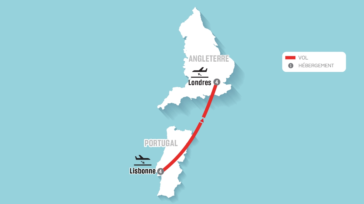 • Vols aller-retour : vol pour l’aller à destination de Lisbonne; vol de retour au départ de Londres (si l’option Vols et Hôtel est choisie)