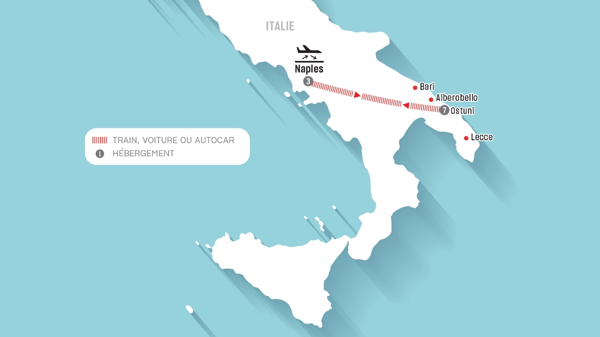 Profitez de ce circuit en duo, avec Naples, la ville emblématique au pied du Vésuve, remplie d'histoire et de gastronomie, et les Pouilles, la région ensoleillée sur le talon de l'Italie, avec ses vastes jardins d'oliviers et ses eaux bleues étincelantes.