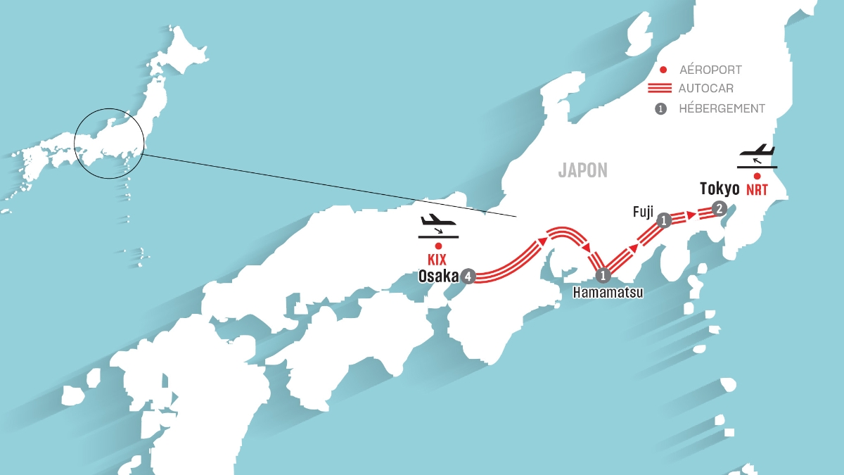 • 8 nuits d’hébergement supérieur avec repas inclus selon l’itinéraire (4 nuits à Osaka, 1 nuit à Hamamatsu, 1 nuit à Fuji, 2 nuits à Tokyo).