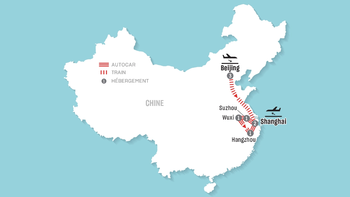 - 8 nuits d’hébergement dans la catégorie sélectionnée (3 nuits à Beijing, 1 nuit à Suzhou, 1 nuit à Wuxi, 1 nuit à Hangzhou, 2 nuits à Shanghai)