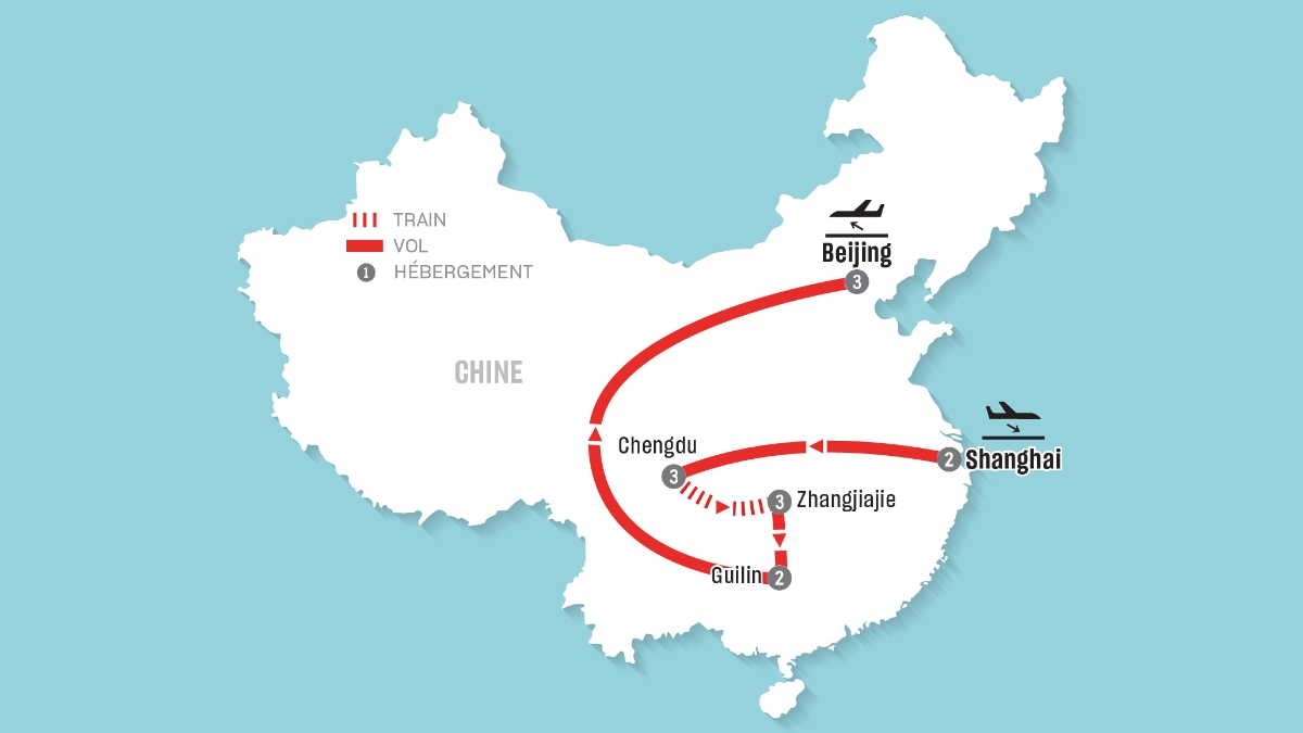 - 13 nuits d’hébergement supérieur (2 nuits à Shanghai, 3 nuits à Chengdu, 3 nuits à Zhangjiajie, 2 nuits à Guilin et 3 nuits à Beijing)