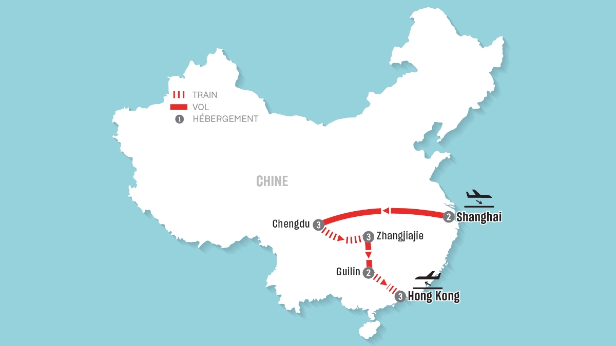 13 nuits d’hébergement en catégorie Supérieure (2 nuits à Shanghai, 3 nuits à Chengdu, 3 nuits à Zhangjiajie, 2 nuits à Guilin, 3 nuits à Hong Kong)