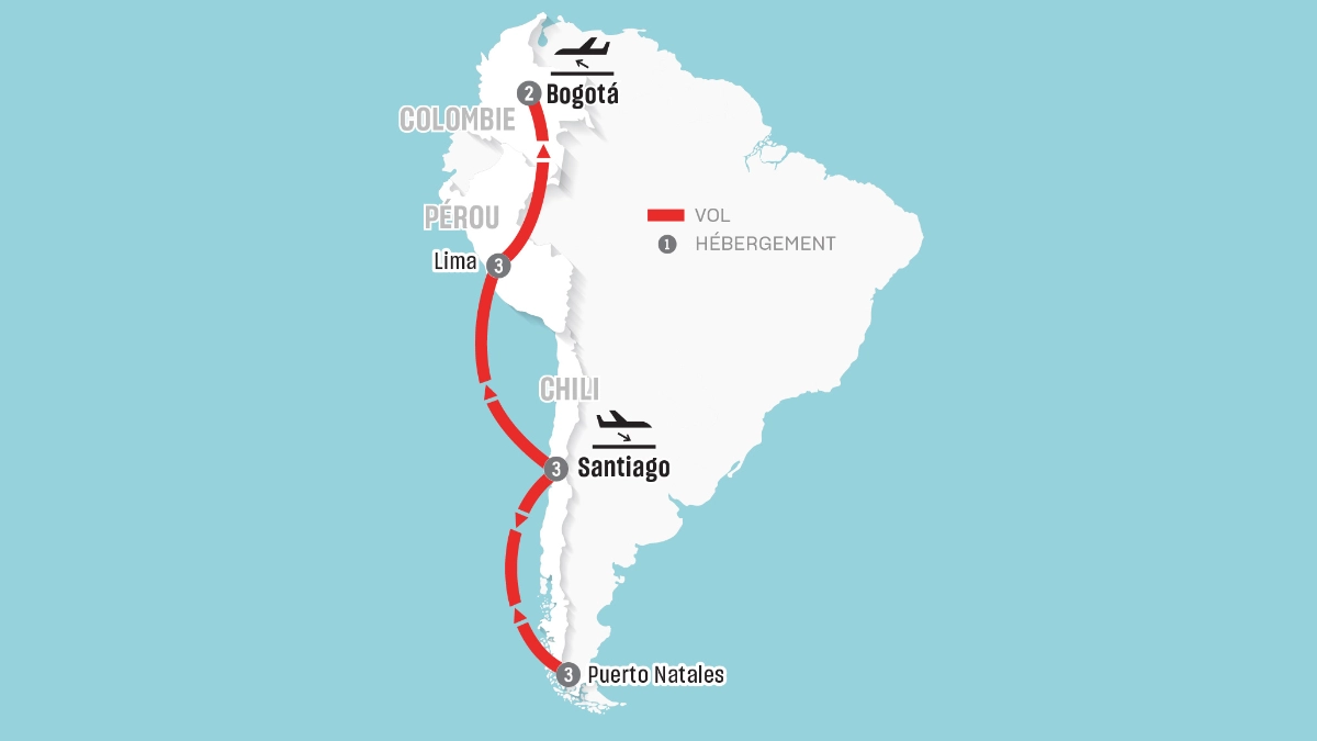• 11 nuits d’hébergement supérieur (3 nuits à Santiago, 3 nuits à Puerto Natales, 3 nuits à Lima, 2 nuits à Bogotá)