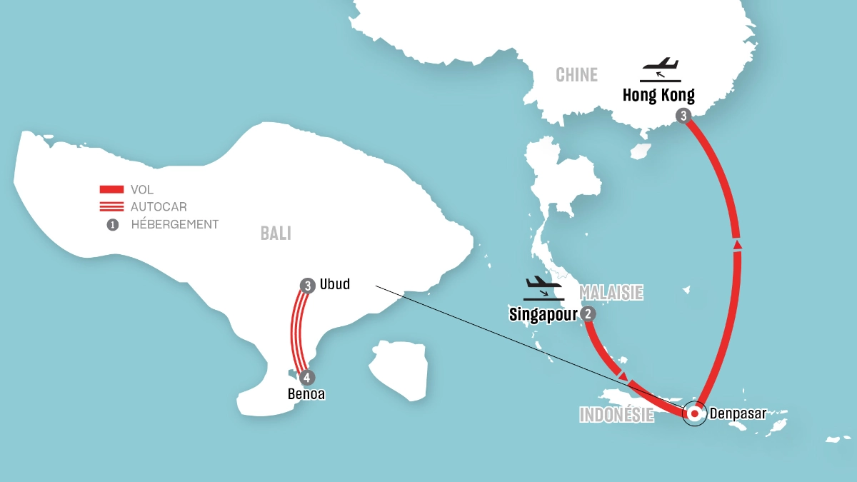 - 12 nuits en hébergement supérieur (2 nuits à Singapour, 3 nuits à Ubud, 4 nuits à Benoa-Bali, 3 nuits à Hong Kong)