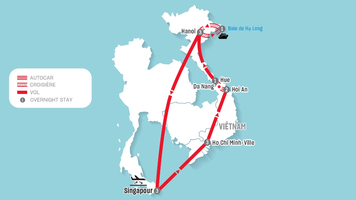 - Vol entre Singapour et Hô Chi Minh-Ville, entre Hô Chi Minh-Ville et Da Nang, entre Hué et Hanoï et entre Hanoï et Singapour