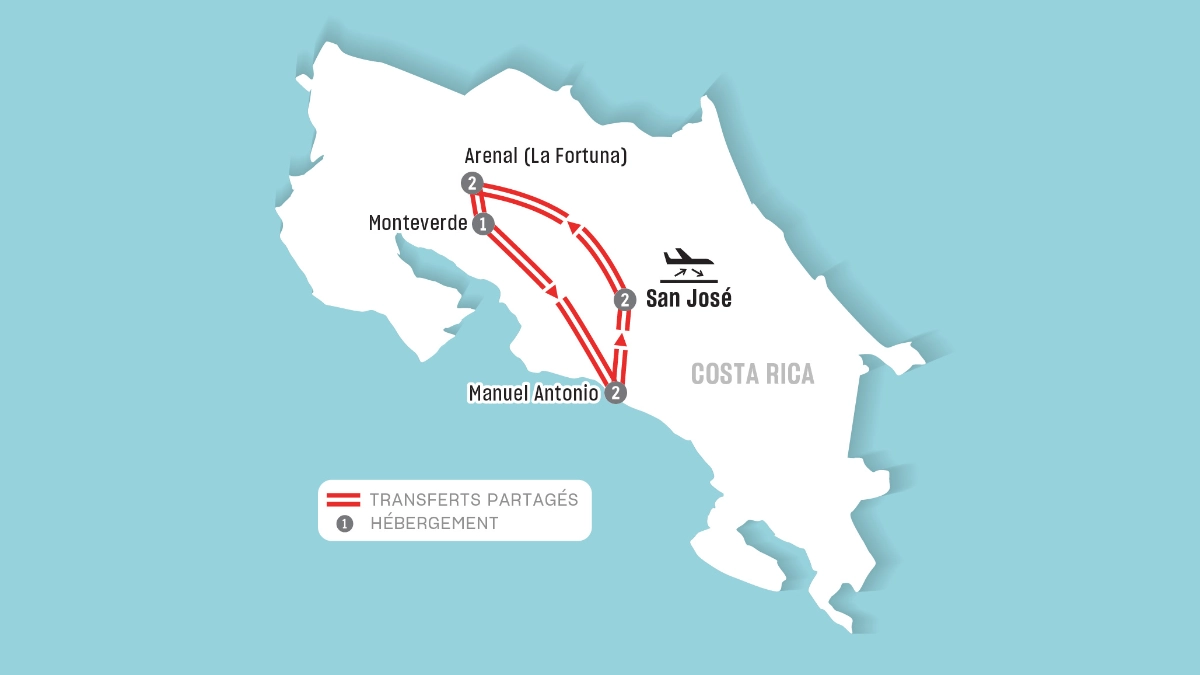 - 7 nuits d’hébergement (1 nuit à San José, 2 nuits à Arenal, 1 nuit à Monteverde, 2 nuits à Manuel Antonio, 1 nuit à San José)