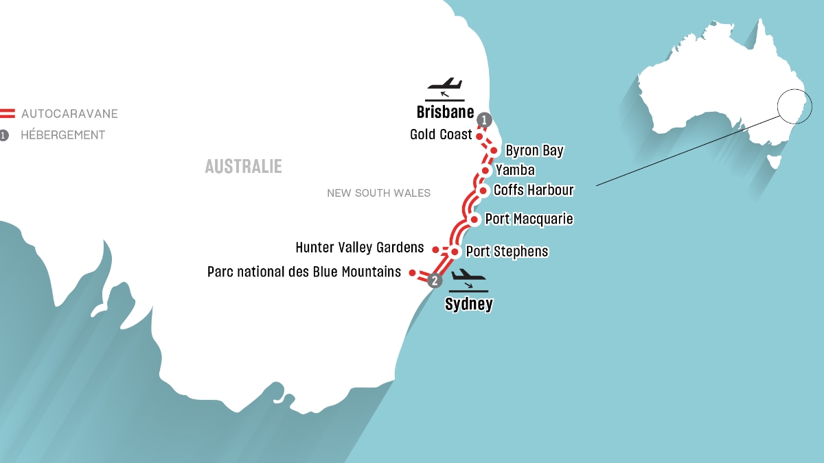 Commencez votre voyage à Sydney, avec ses monuments mondialement connus et sa culture dynamique, puis partez vers le nord à travers une mosaïque de merveilles naturelles et de communautés côtières décontractées. De Byron Bay, haut lieu du surf, à l’arrière-pays luxuriant près de Coffs Harbour, en passant par Brisbane, la capitale subtropicale du Queensland, chaque étape ajoute une nouvelle dimension à votre escapade routière.