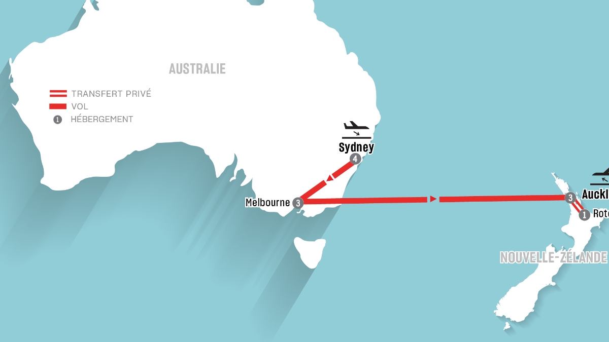 - Vol pour l’aller à destination de Sydney, en Australie; vol de retour au départ d’Auckland, en Nouvelle-Zélande (si le forfait Vols et Hôtel est sélectionné)