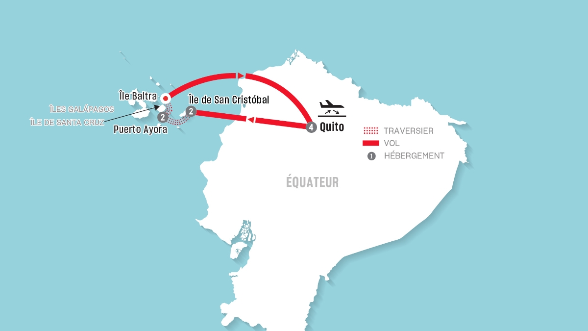 Après le petit-déjeuner et après avoir quitté votre hôtel, votre représentant local vous retrouvera dans le hall de l’hôtel. Il vous accompagnera jusqu’à l’île Baltra pour que vous puissiez prendre votre vol de retour vers Quito.