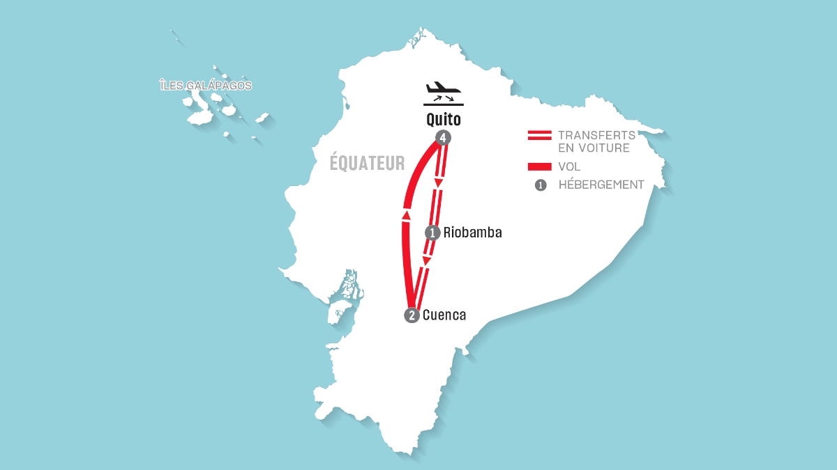 - 7 nuits d’hébergement dans la catégorie sélectionnée (4 nuits à Quito, 1 nuit à Riobamba, 2 nuits à Cuenca)
