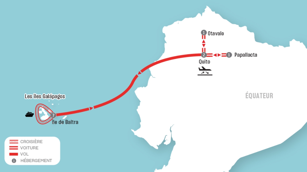 - 11 nuits d’hébergement dans la catégorie sélectionnée (2 nuits à Quito, 1 nuit à Otavalo, 7 nuits à bord d’une croisière aux Galápagos, 1 nuit à Papallacta)