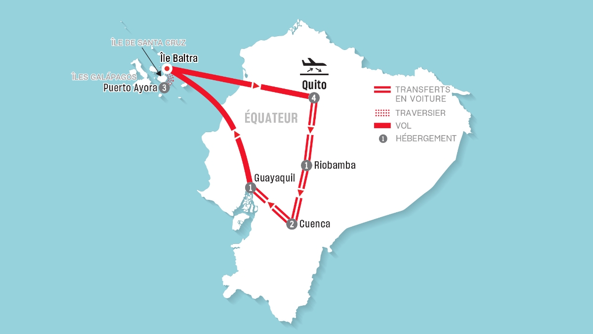 - 11 nuits d’hébergement dans la catégorie sélectionnée (4 nuits à Quito, 1 nuit à Riobamba, 2 nuits à Cuenca, 1 nuit à Guayaquil, 3 nuits à Puerto Ayora)
