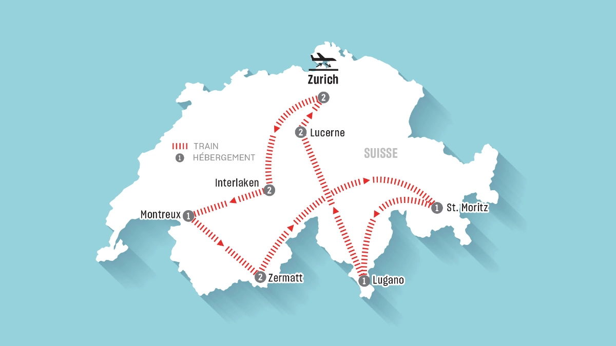 Après le petit-déjeuner, quittez l’hôtel et rendez-vous à la gare pour prendre votre train à destination de Zurich. Profitez du reste de la journée pour explorer à votre rythme.